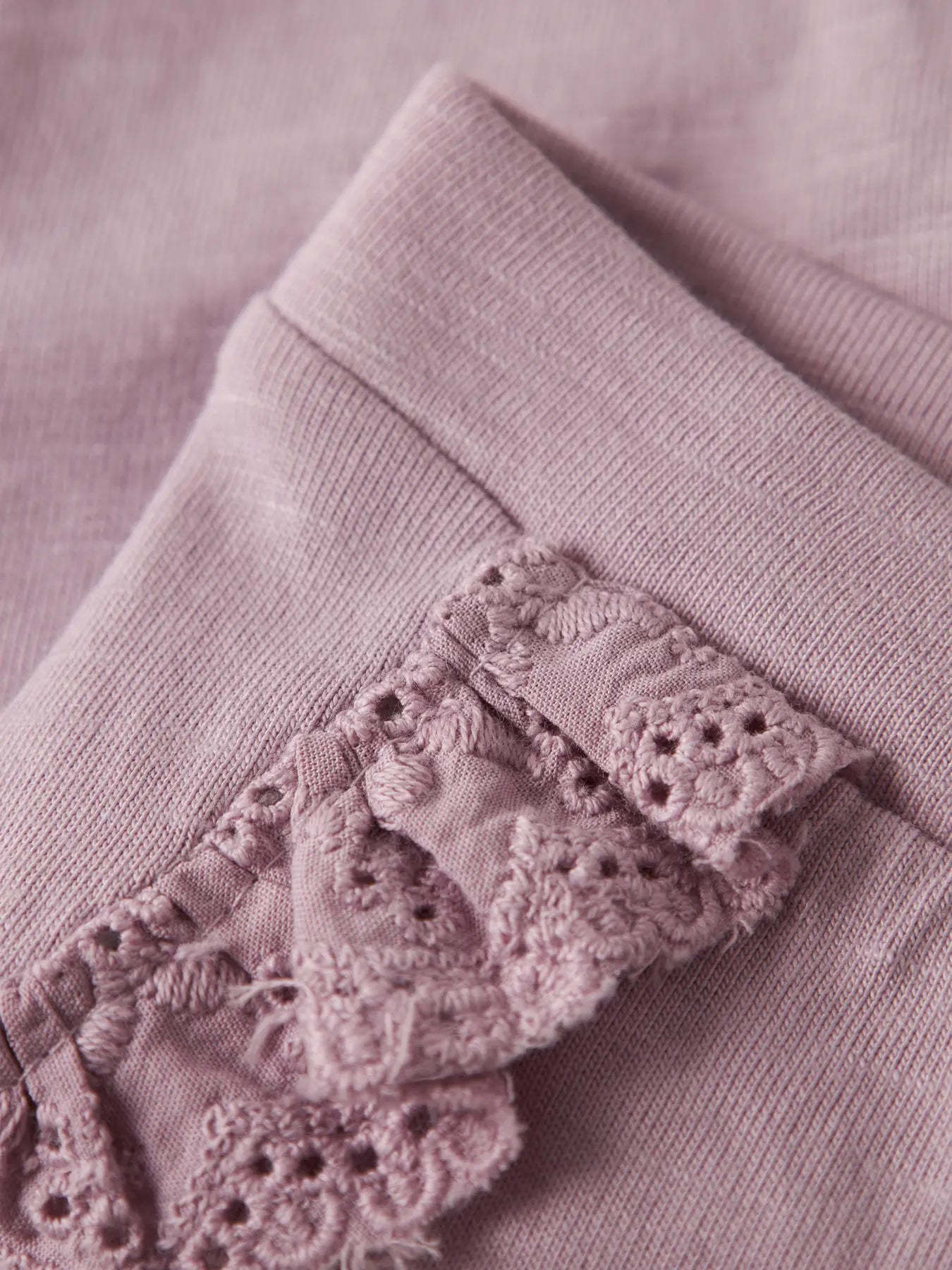 Disse leggings er lavet i et blødt og behageligt materiale, der giver god komfort og bevægelsesfrihed hele dagen. De fine flæsedetaljer i blonde på siderne tilfører et sødt og feminint udtryk, som gør leggingsene ekstra charmerende.