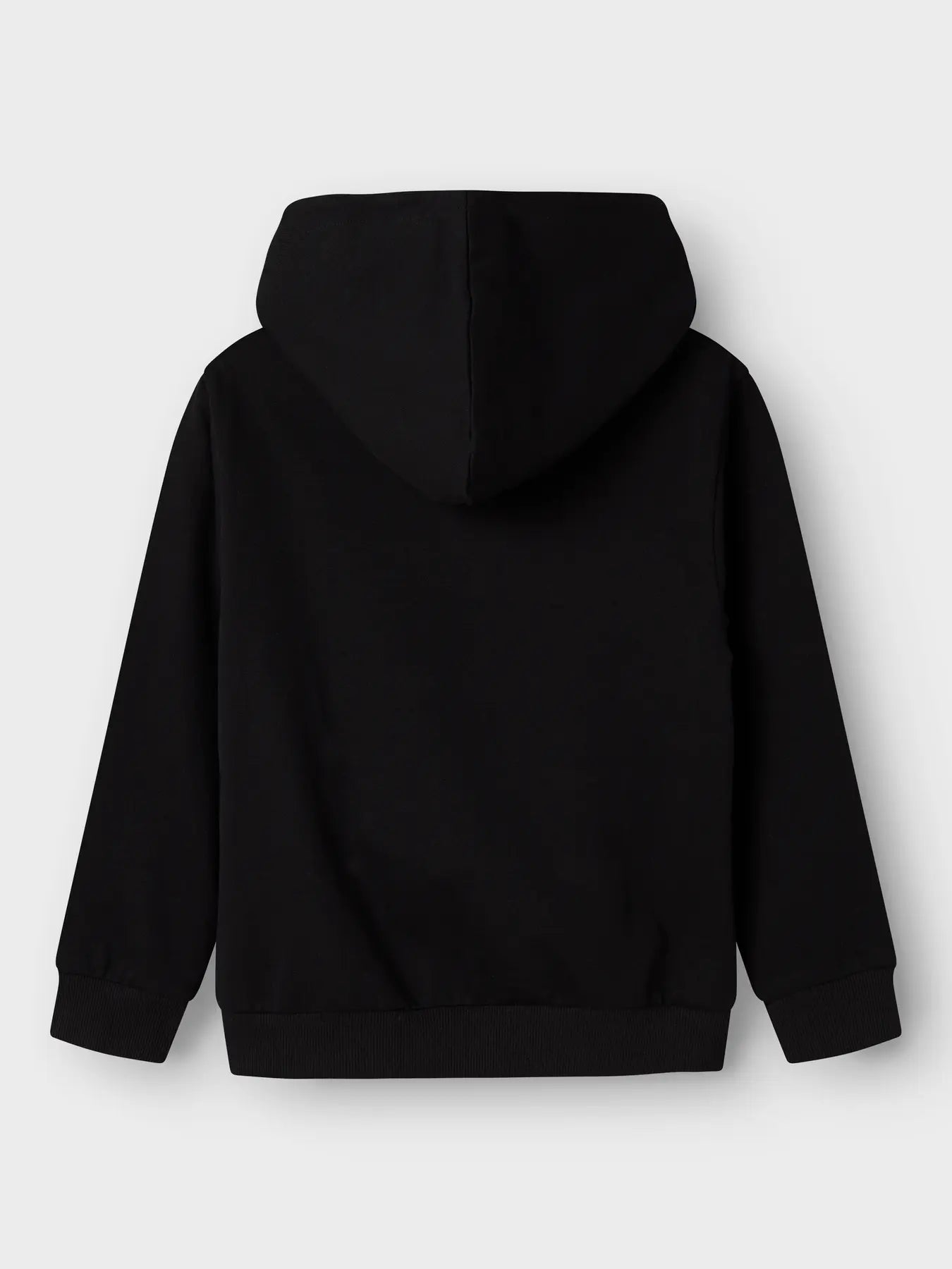 Flot hættetrøje fra Name It i sort med et stort og farverigt print af Stitch med et markant smil. Over grafikken står "STITCH" med røde bogstaver på en baggrund med leopardmønster. Hættetrøjen fra Name It har en blød hætte samt ribkanter ved ærmer og nederst.