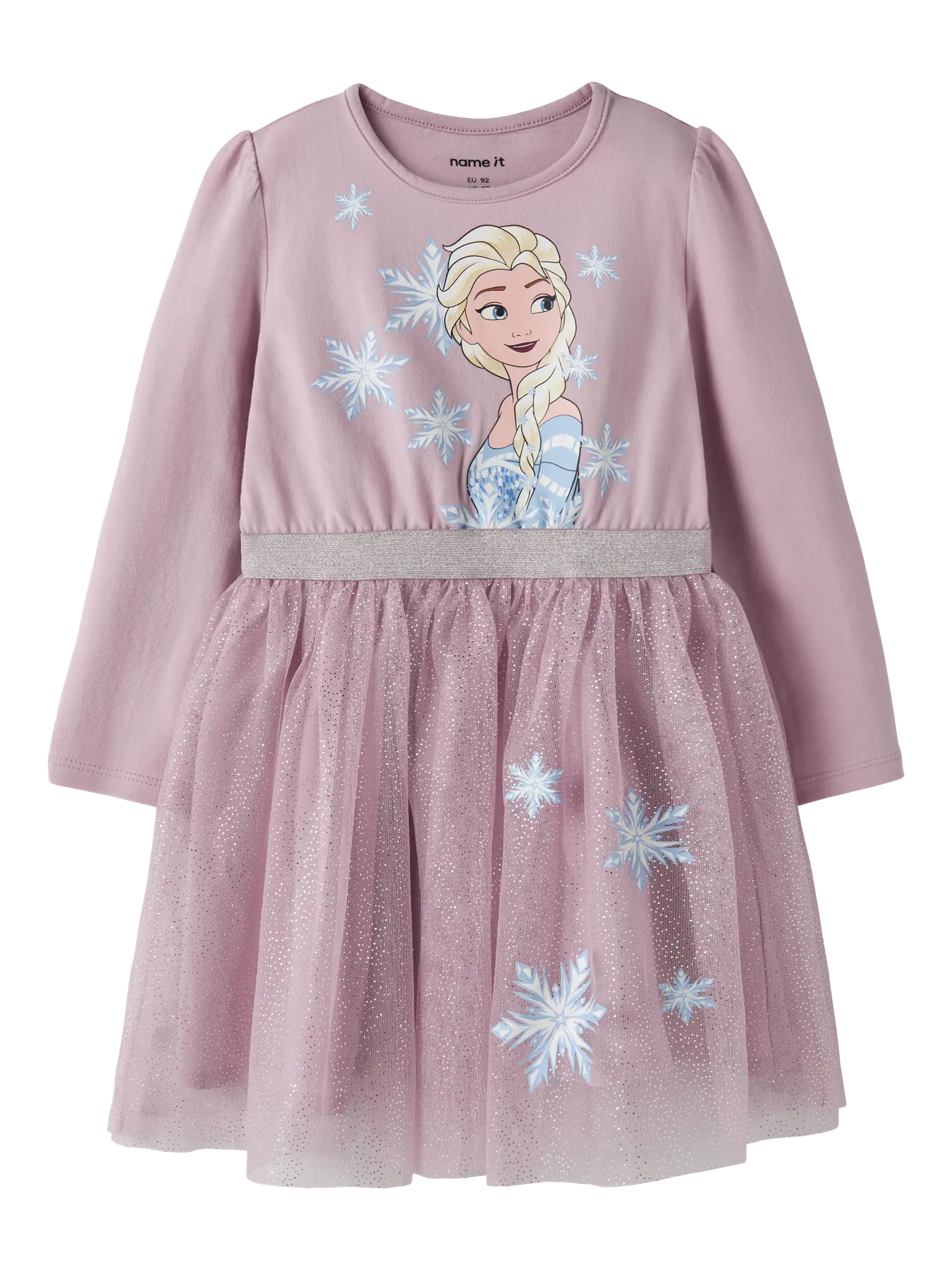 Lyserød kjole fra Name It med lange ærmer. Kjolen kombinerer en blød bomulds-overdel med et glimrende tylskørt og har et karaktertryk med snefnug på fronten.