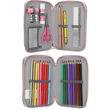 Tag skolestarten til nye højder med TOPModel Leoheart Triple Pencil Case Med Sløjfe. Dette charmerende lyserøde penalhus, prydet med TOPModel i en sød positur og dekorative sløjfer i håret, er designet ikke kun for at være iøjnefaldende, men også utrolig praktisk. Dens tre separate rum, hver fyldt med 18 farve- og tuschpenne, 2 blyanter samt essentielle skoleartikler som spidser, viskelæder, lineal, saks og limstift, gør det let at holde styr på dine skriveredskaber og tilbehør. Leo-printet på lynlåsene tilføjer et legende touch, mens den lille velcropose er ideel til små genstande. Fremstillet i 100% PES sikrer det holdbarhed og let vedligeholdelse—perfekt til det daglige skolebrug. Alder: Fra 6 år Ekstra: Advarsel. Kvælningsfare. Små dele. Ikke egnet til børn under 36 måneder. Materialer: 100% polyester, zinklegering, silikone, PP (polypropylen), papir Mål: Størrelse 7,5 x 13 x 20 cm Certificeringer: CE-certificeret Tre seperate rum fyldt med: 18 farve- og tuschpenne 2 Blyanter...